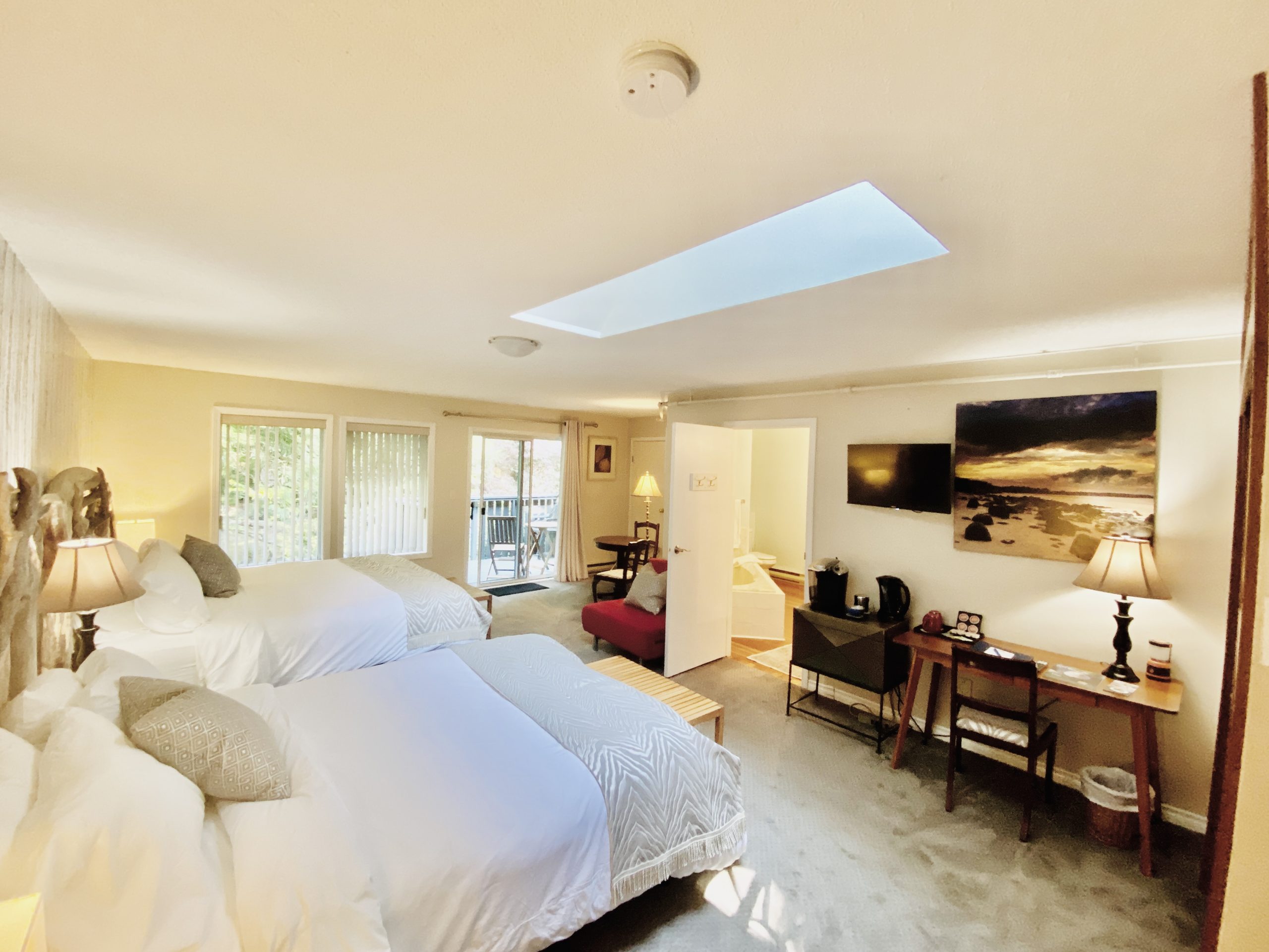 This ground floor room has two Queen beds, a large private en-suite bathroom, refrigerator, coffee, and tea in room. Private entrance and private patio
