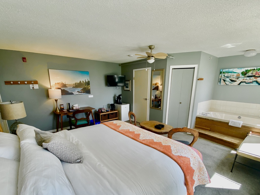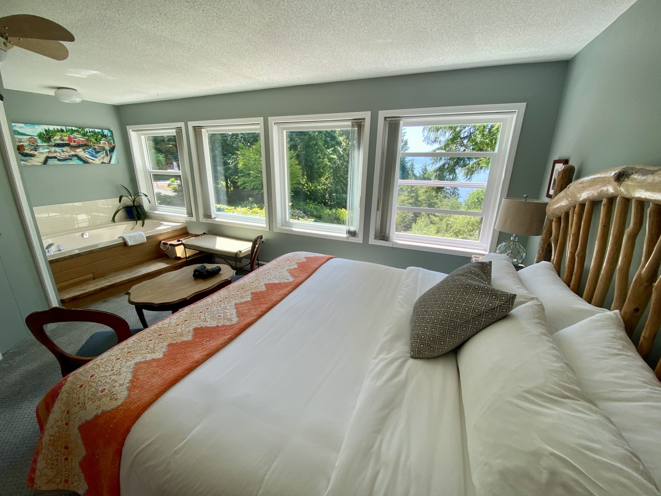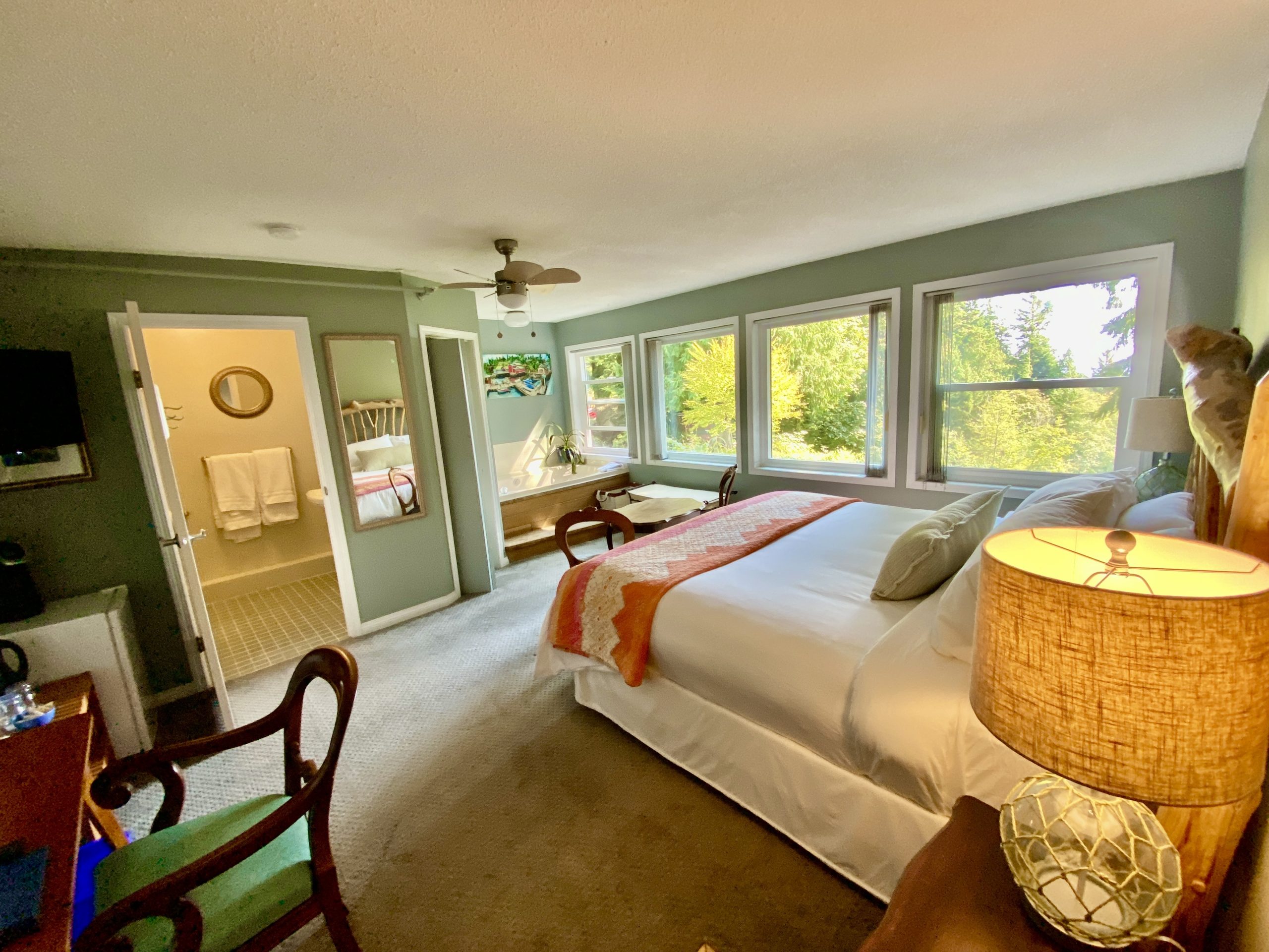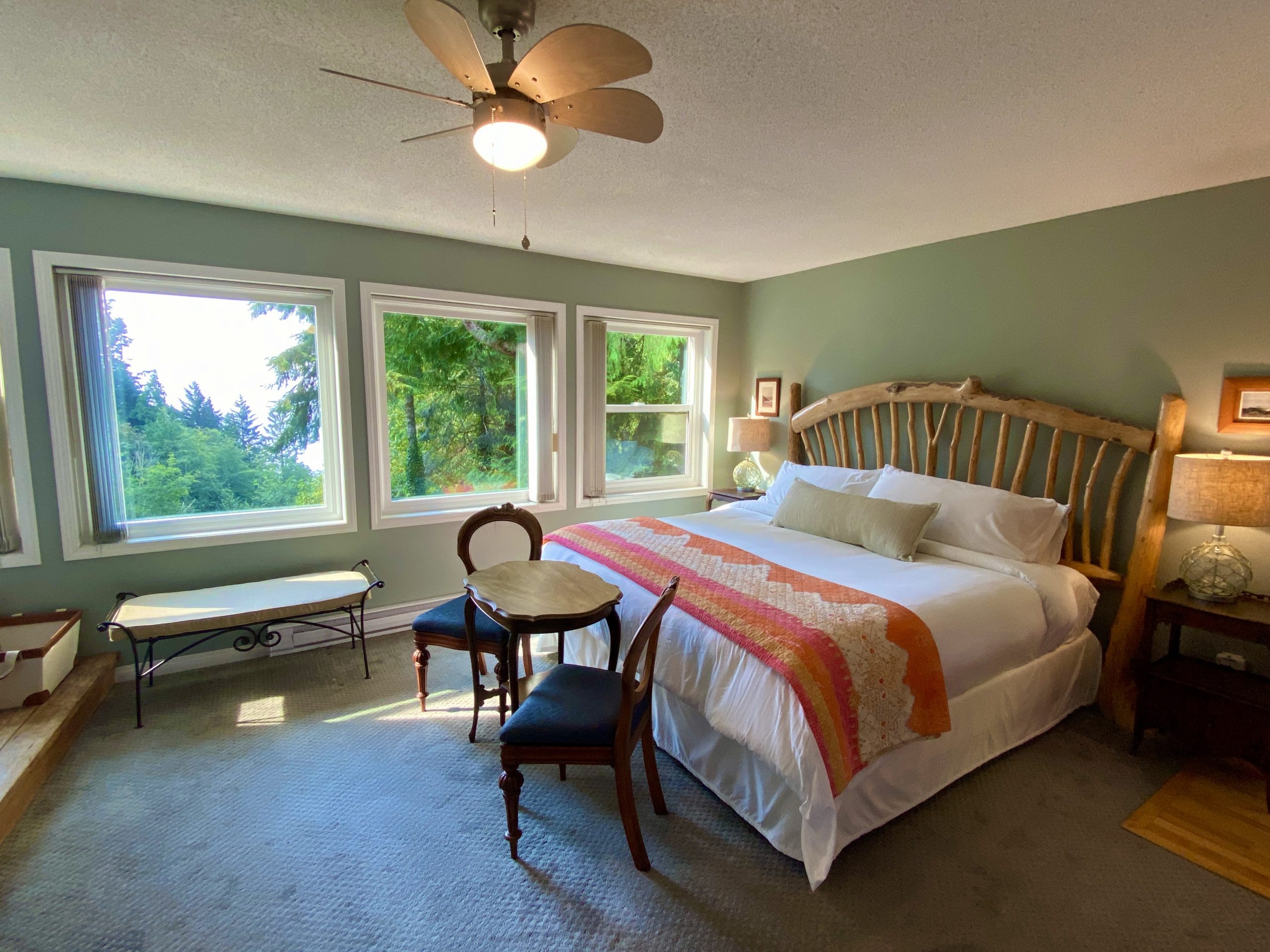 The Salish Sea suite offers a cozy and inviting retreat with serene forest views and the soothing sounds of the nearby ocean. Featuring a plush King bed, an en-suite bathroom, and a comfortable sitting area, this suite provides the perfect balance of relaxation and West coast charm.